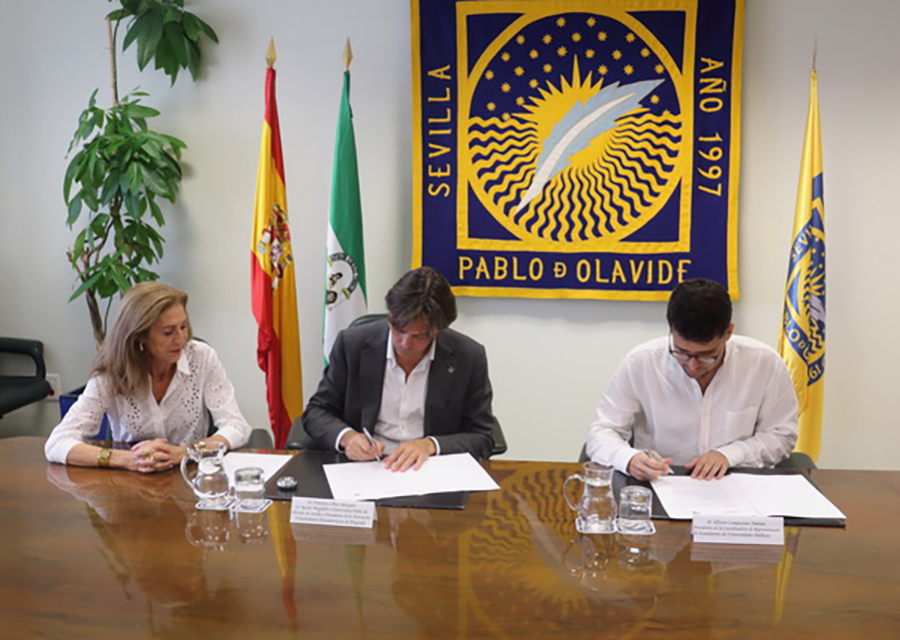 El acuerdo fue suscrito por D. Francisco Oliva Blázquez, presidente de la AUIP y rector de la Universidad Pablo de Olavide, y por D. Alfonso Campuzano Jiménez, presidente de la CREUP. El acto contó además con la presencia de D.ª María Chantal Pérez Hernández, directora general de la AUIP, quien acompañó la firma en representación de la Asociación.